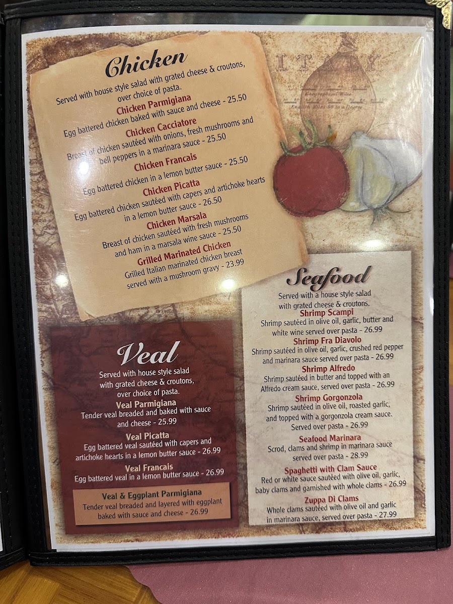 Scrod, Clams, and Shrimp in Marinara Sauce served over your choice of pasta