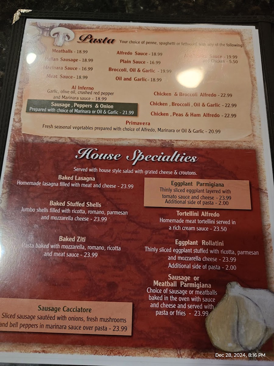 Sliced sausage sauteed with onions, fresh mushrooms and bell peppers in marinara sauce over pasta